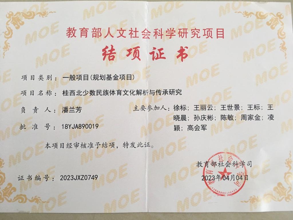 近日,我院潘兰芳教授于2018年获批的教育部人文社会科学研究一般项目《桂西北少数民族体育文化解析与传承研究》已顺利结项。