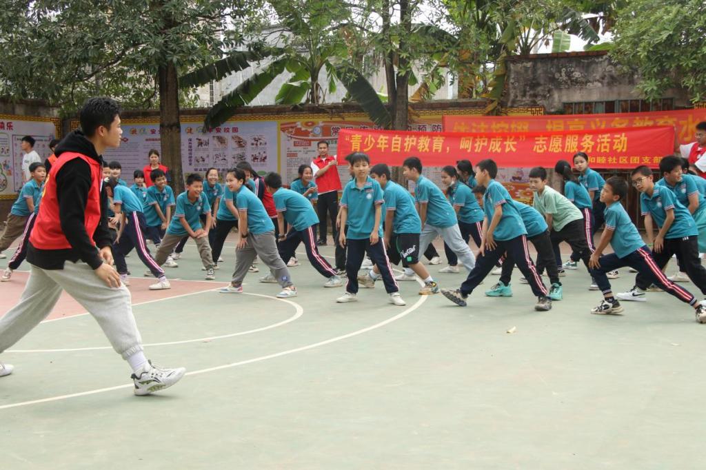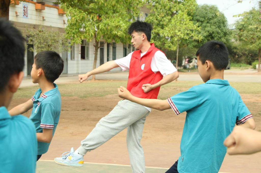 活动中,部分志愿者在操场带领学生们学武术,另一部分志愿者于教室带领学生做眼保健操以及小游戏,学生们积极配合,在志愿者们的带领下有序展开活动。