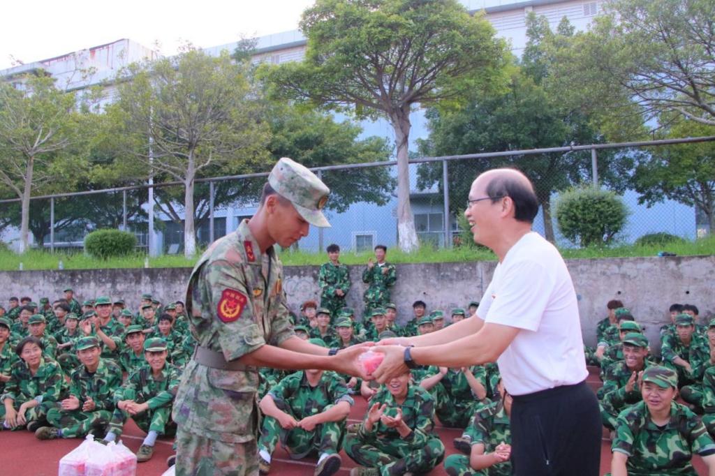 服务期间,周必宁携学生干部干为现场人员发放西瓜并代表学院党委对带训教官和教师的辛勤付出表示感谢。他表示军训作为国防教育的重要形式,是大学通识教育的重要课程,对学生们扣好人生第一颗扣子至关重要。