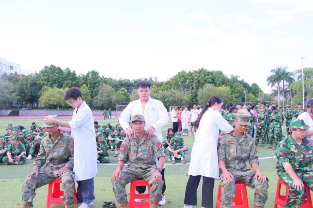 训练场上,康协工作人员为带训教官进行按摩推拿,同时为现场学生进行基础按摩理论讲解,并对常见运动损伤病症的来源及治疗等相关知识进行解读。康协工作人员根据教官的不同需求,有针对性的为他们按摩穴位、放松肌肉,让他们体验了一次专业的按摩服务。