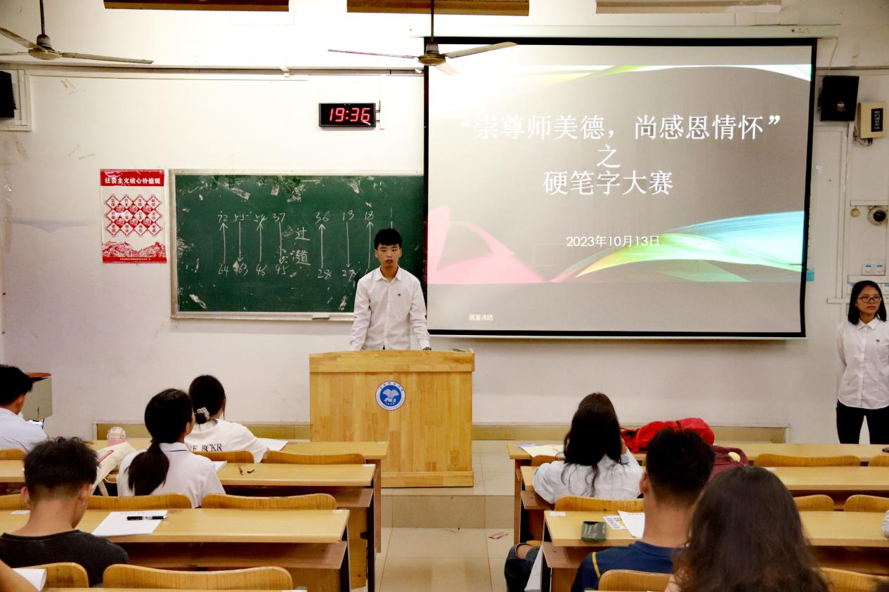 为弘扬中华民族传统文化,激发学生写字练字的兴趣,培养学生规范书写美观汉字的能力,进一步养成良好的书写习惯。10月13日晚上,诸侯快讯入口官网于玉林师范学院东校区厚德楼2-203教室举办2023年诸侯快讯入口官网“崇尊师美德尚感恩情怀”硬笔字大赛。本次活动邀请该院全体辅导员作为评委,活动由曹佳琦主持。