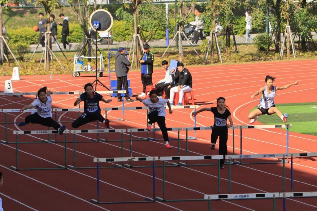 11月16日下午,我校第二十四届运动会之女子乙组100米跨栏决赛在我校东区西田径场如火如荼地进行。