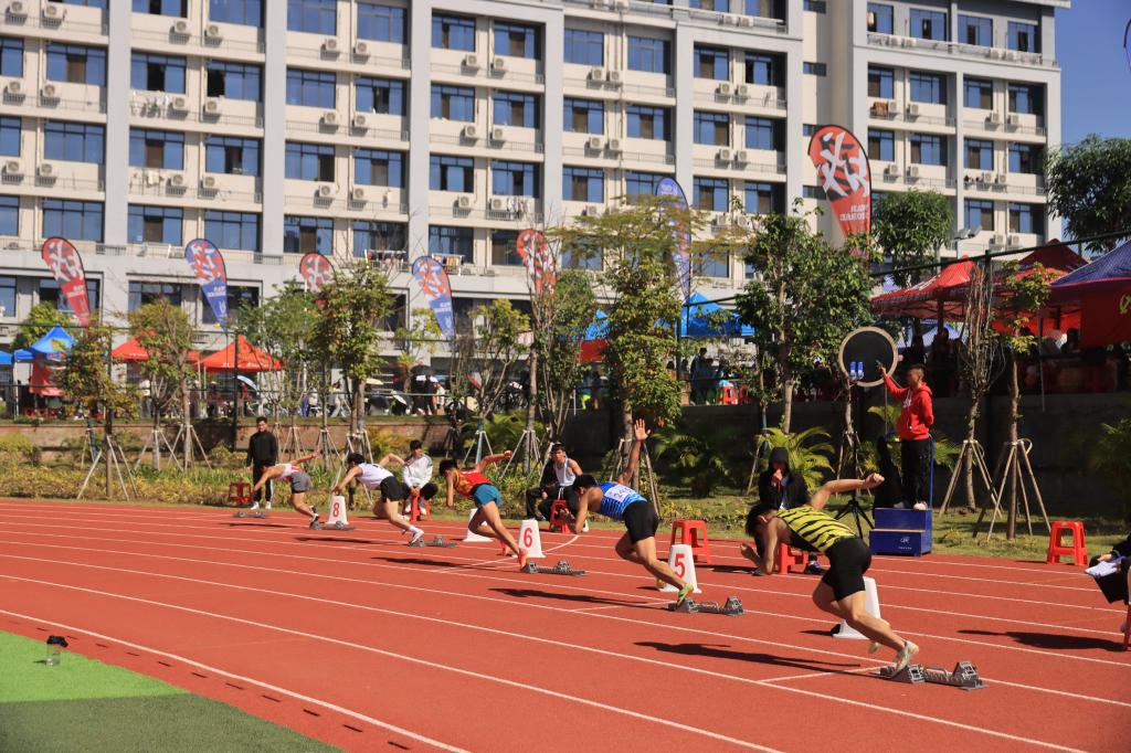 比赛前,运动员正在积极的进行着热身。他们每个人都怀着激动又紧张的心情,等待着自己上场。预跑口令下达后,运动员们双手撑地,他们坚定的双眼目视前方。随着比赛枪声一响,运动员们犹如离弦的箭一般飞奔冲向终点,这是一场速度的比拼。运动员们咬紧牙关,快速而有力地摆动双臂,平稳而快速地踏出每一步。他们你追我赶,像一匹匹脱缰的野马拼尽全力往前冲。赛道上他们的身姿充满了青春活力,激情无限,火力全开。场外拉拉队员聚集在赛道两旁,嘶声力竭地呐喊助威,赛场气氛火热而高涨。