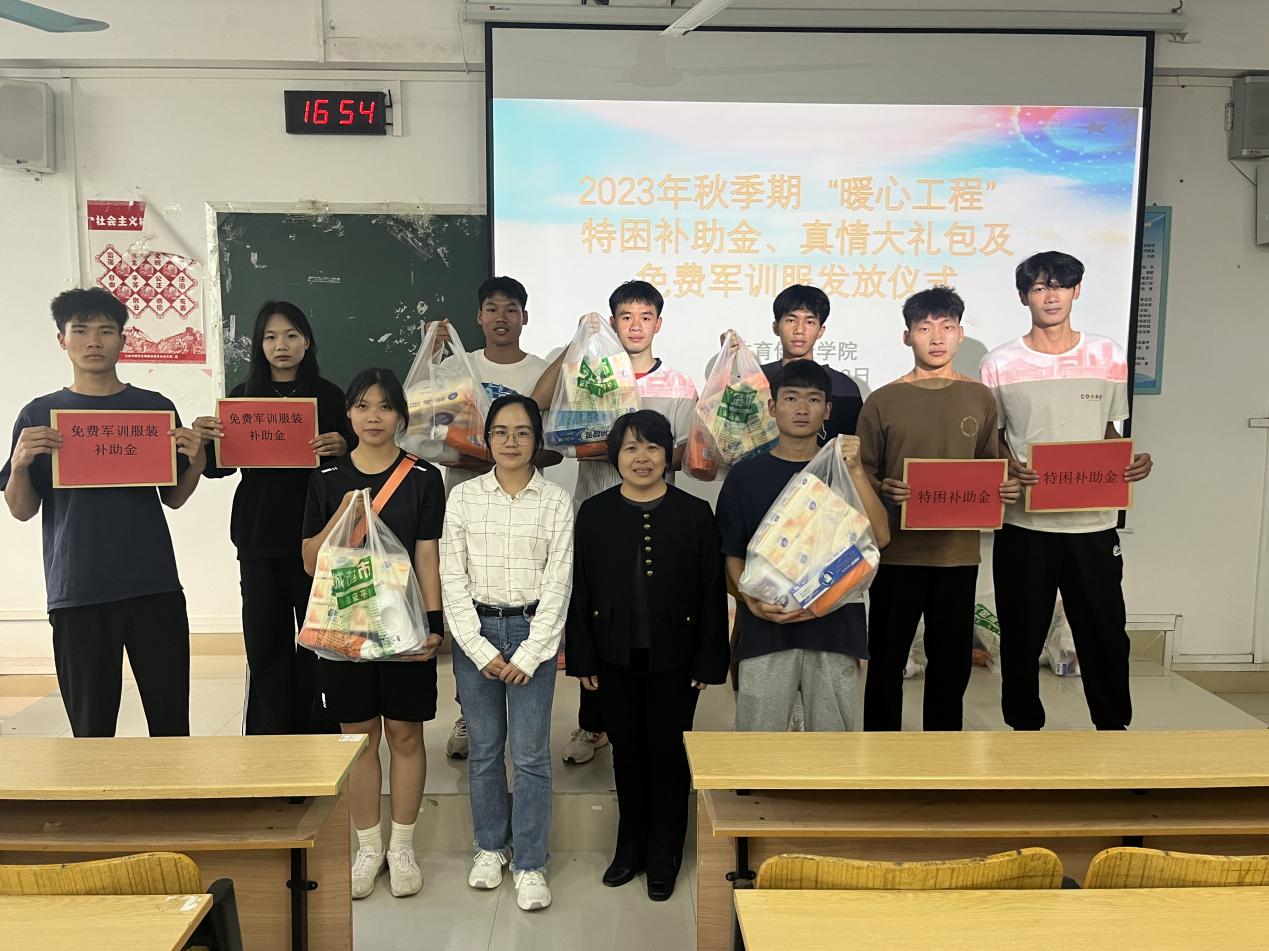 为了彰显关爱2023级家庭经济困难学生情怀,11月28日下午,我院于我校东校区厚德楼2-207教室举行2023年秋季"暖心工程"特困补助金、真情大礼包及免费军训服发放仪式活动。参加本次活动的有我院党委副书记江俊、辅导员伍灿明以及获得“暖心工程”项目学生代表。本次活动由伍灿明主持。