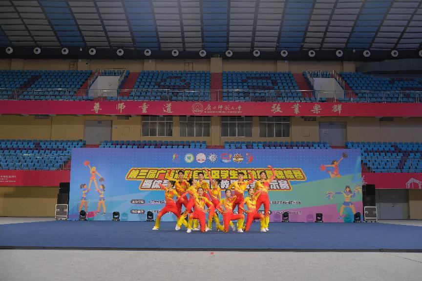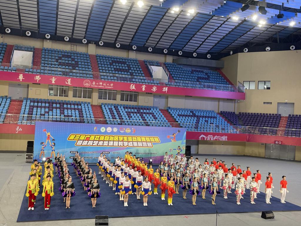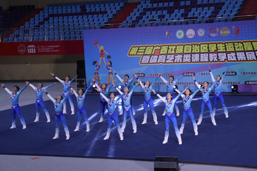 2024年6月14日至16日,由广西学校体育卫生艺术学会主办的第三届广西壮族自治区学生运动操舞锦标赛暨体育艺术类课程教学成果展示赛在广西师范大学(雁山校区)开赛,我校派出一支由两名教练员、19名运动员共同组成的队伍参赛,分别参与了花球示范、徒手健身操、第九套广播体操和体育艺术类课程教学成果展示赛4个项目。本次赛事有来自广西12个地市数百名运动员参加比赛。
