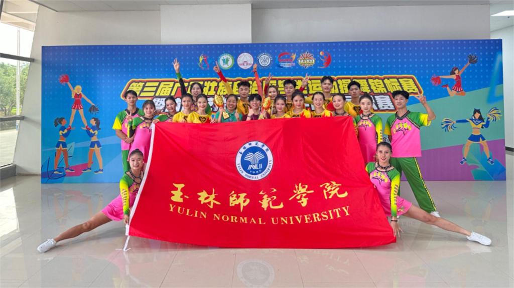 由我校教师马少坤、吕增逸带领的玉林师范学院健美操队,历经三天艰苦奋战,共在四场比赛中荣获四个奖项,分别是体育专业组-示范花球冠军、体育专业组-广播体操冠军、体育艺术类课程教学成果赛一等奖、体育专业组-徒手健身操亚军。